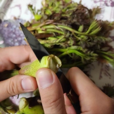 두릅은 뿌리 부분에 붙어있는 갈색 떡잎을 제거하여 손질합니다. 손질을 다 하면 두릅의 뿌리 부분이 드러나는데 뿌리 부분은 칼로 잘라주는 것이 식감에 좋습니다.