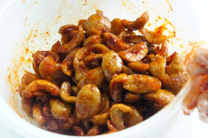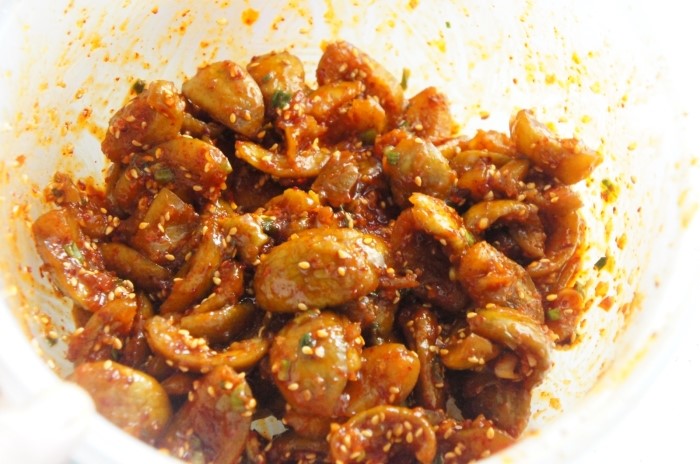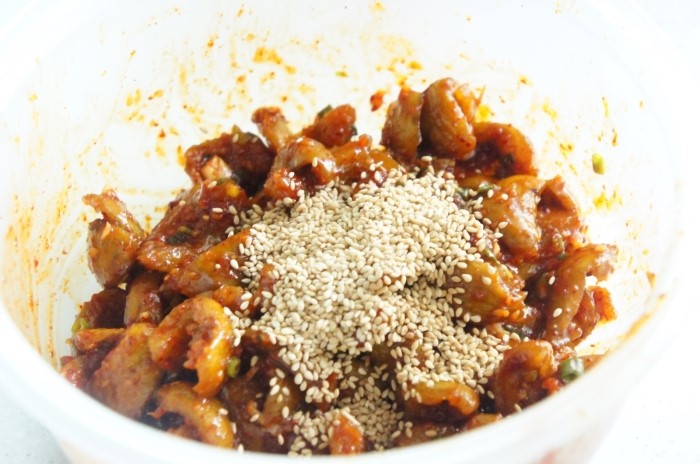 9. 고추장과 고추가루를 넣고 조물조물해줍니다