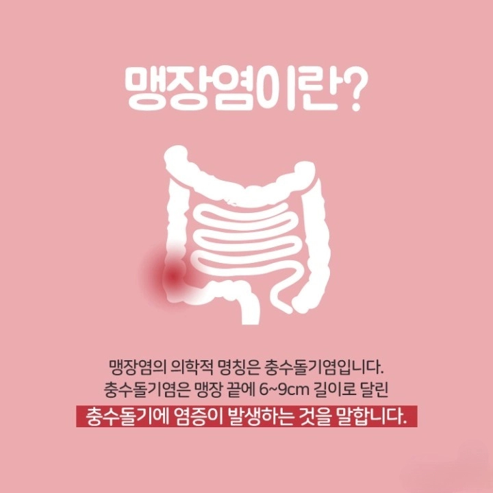 맹장염은 단단하게 굳은 변 덩어리나 박테리아, 기생충 감염에 의해 충수 입구가 막히게 되면서 맹장 내부가 염증으로 오염되는 증상을 뜻하는데요.