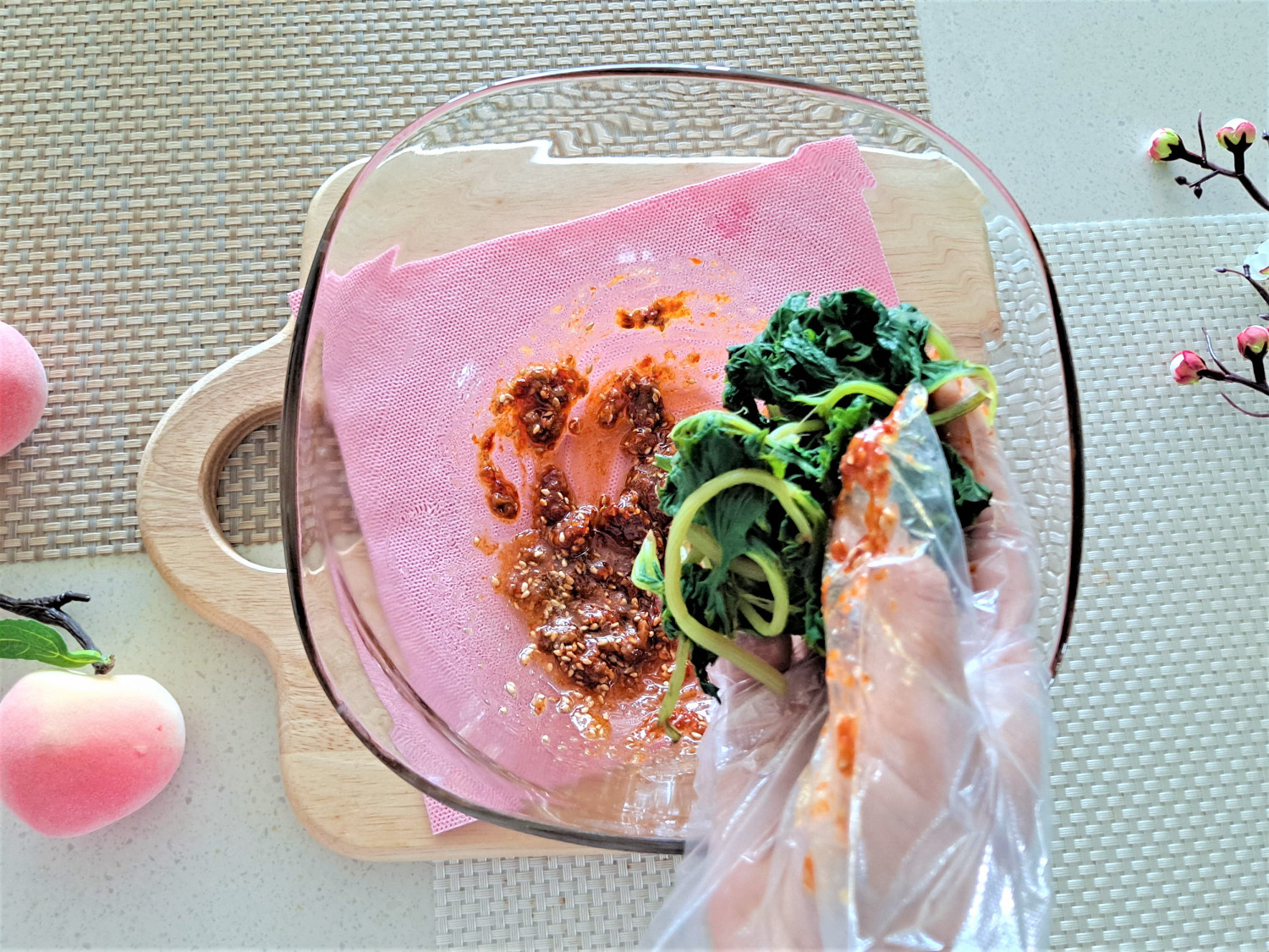 3. 된장 1T, 고추장 1/2T, 다진 마늘 1/2T, 깨소금 1/2T, 매실 진액 1T, 들기름 2T를 넣어