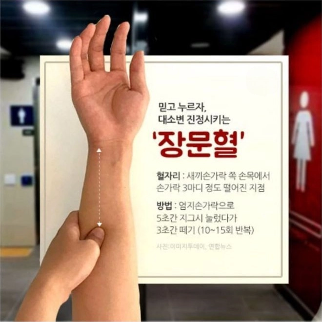 화장실이 급할 때 장문혈을 지압해주면 어느 정도 변을 참을 수 있는 것으로 알려져 있는데요. 흔히 말하는 급똥이 마려울 때 참는법입니다. 화장실이 급한데 참아야할 때 장문혈을 지압하면 복통과 변의를 어느 정도 줄이는데 도움이 될 수 있습니다.