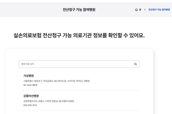 아래 링크에서 실손의료보험 전산청구 가능 의료기관 정보를 확인할 수 있다.